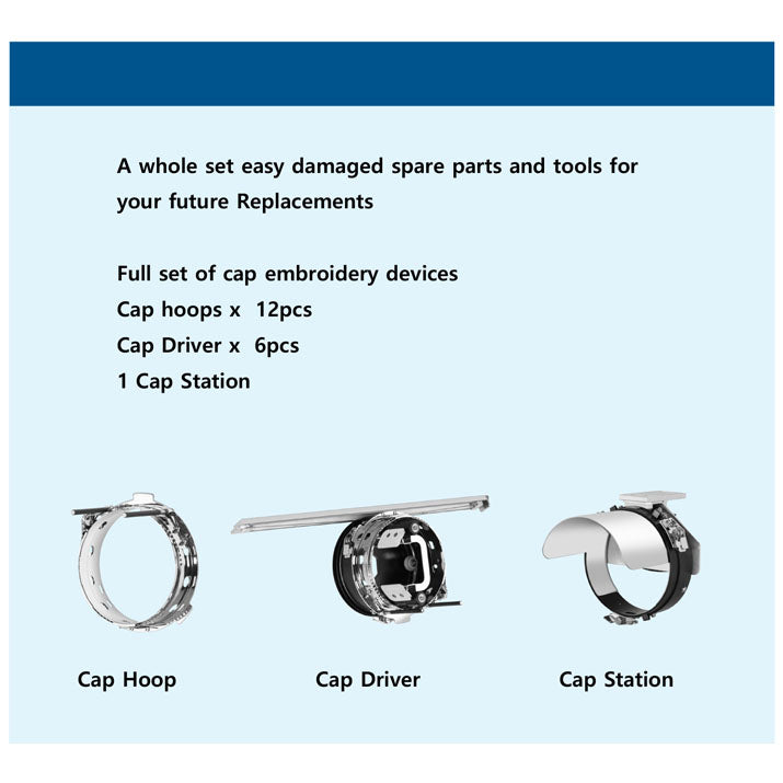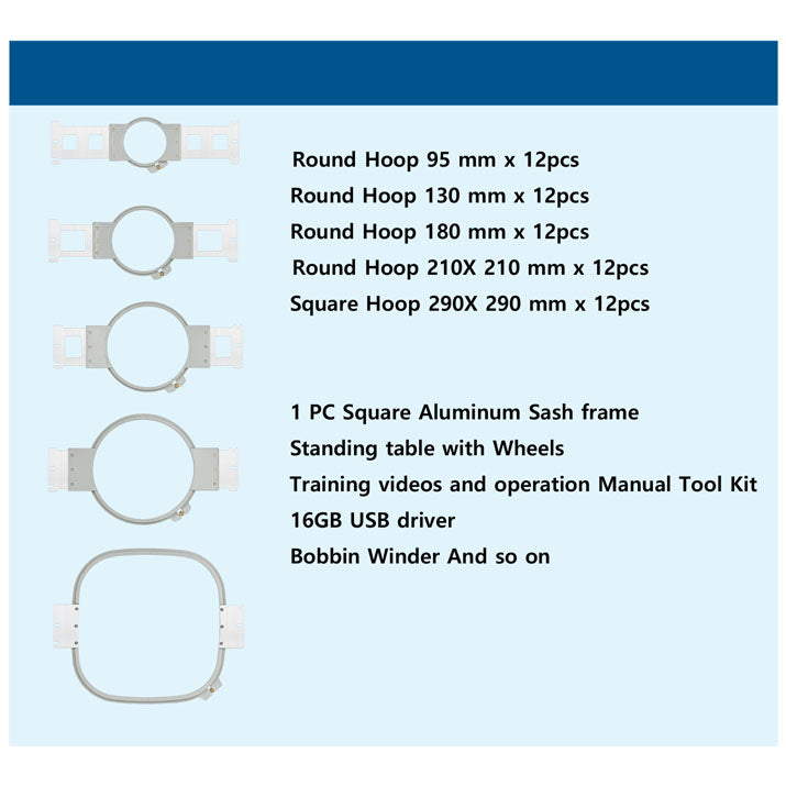 - Cap frames, Aluminum frames, Table, Garment hoops & Tool box